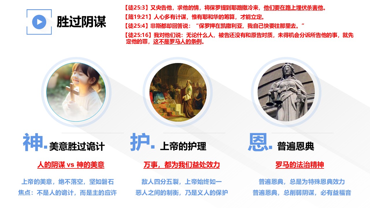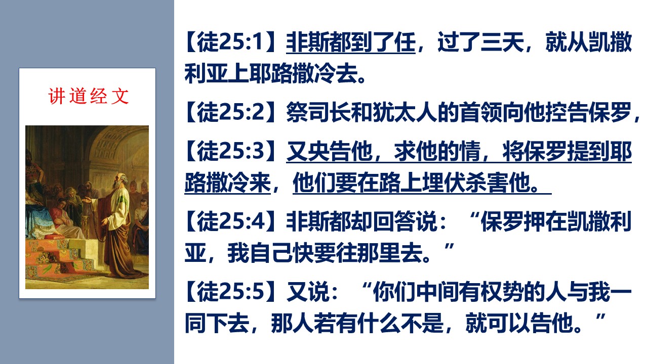 保罗在凯撒利亚关押了两年后,非斯都上任,犹太人再次想暗杀保罗,但这个阴谋却再一次破产。