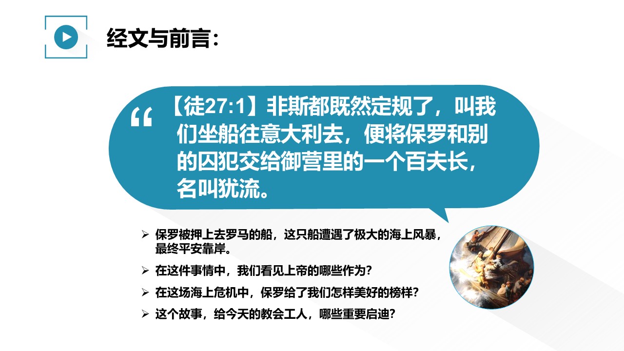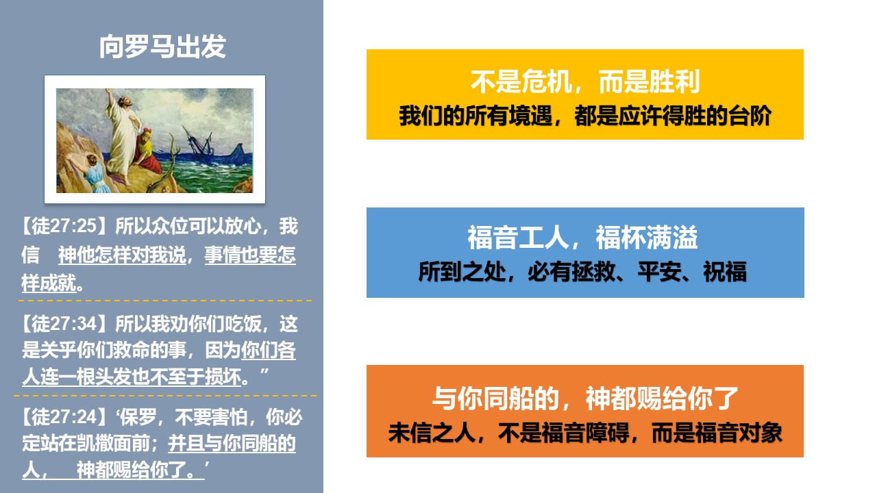 保罗被押上去罗马的船,这只船遭遇了极大的海上风暴,最终平安靠岸。