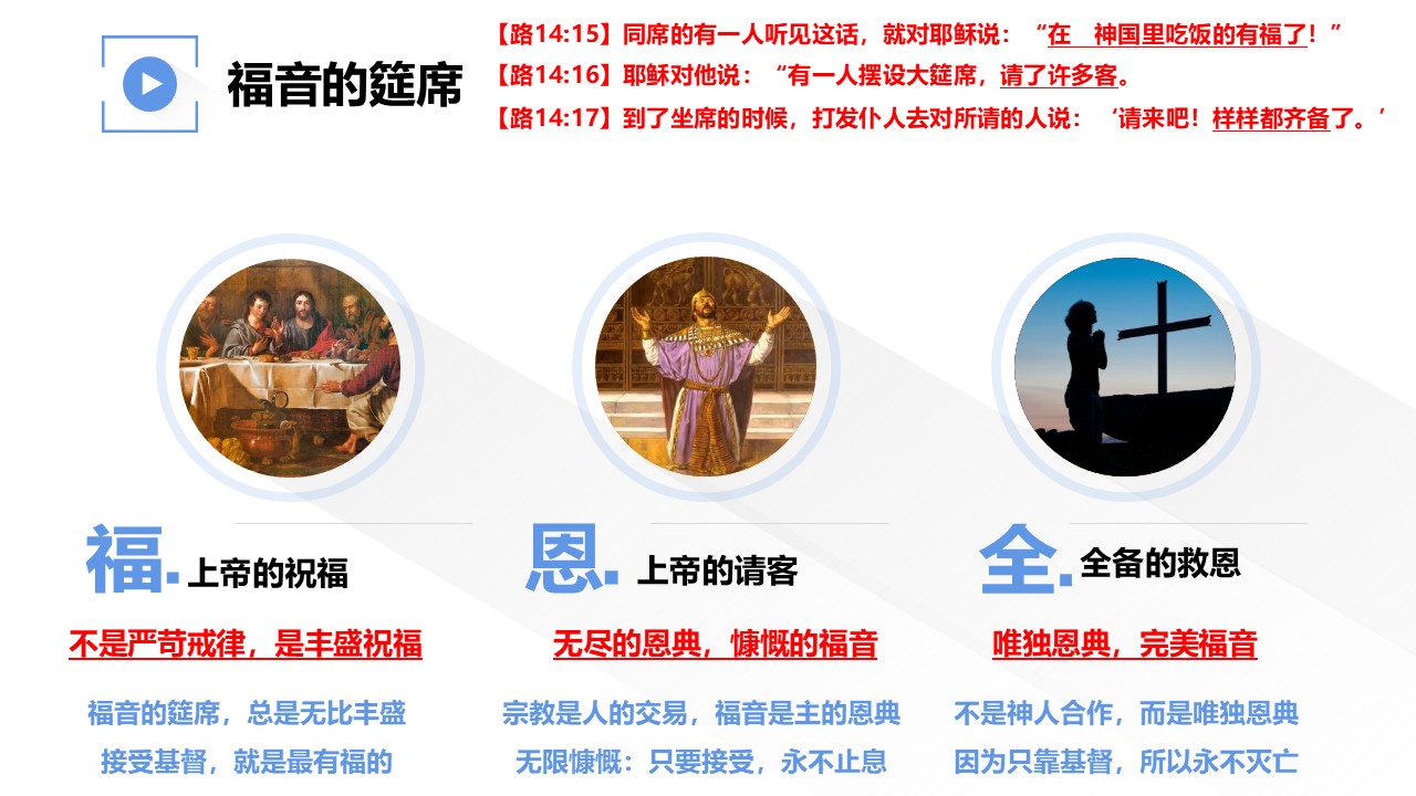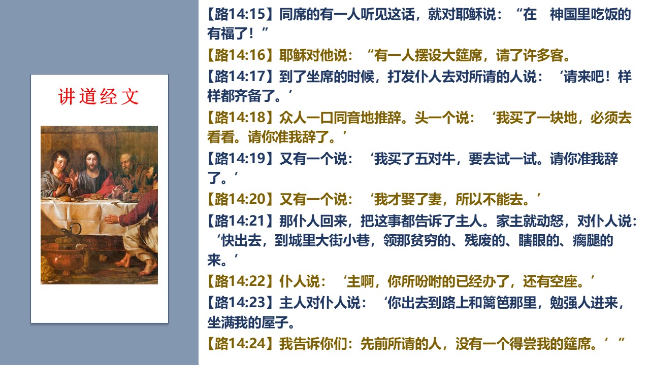 主耶稣讲的大筵席的比喻故事,里面蕴含着很多福音真理。